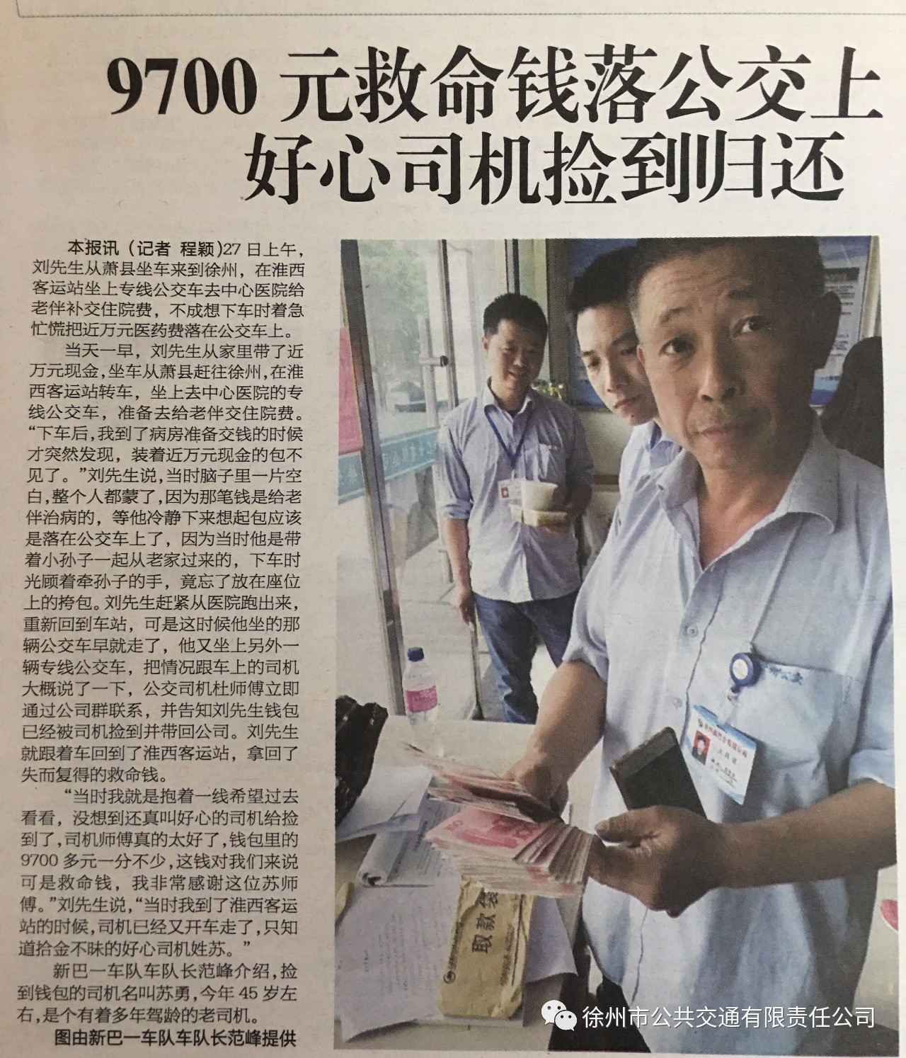 車(chē)隊(duì)管理人員打開(kāi)包尋找乘客的聯(lián)系方式,發(fā)現(xiàn)包里有一個(gè)信封,信封里面裝著9700元現(xiàn)金,便立即將包妥善保管。不久,失主劉先生來(lái)到調(diào)度室尋找,看到失而復(fù)得的包裹十分激動(dòng),他說(shuō):“我抱著一線希望來(lái)這兒看看,沒(méi)想到還真叫好心的司機(jī)給撿到了,9700元一分不少。這錢(qián)對(duì)我們來(lái)說(shuō)是救命錢(qián),今早到醫(yī)院給老伴補(bǔ)交住院費(fèi)的,我非常感謝蘇師傅”。
