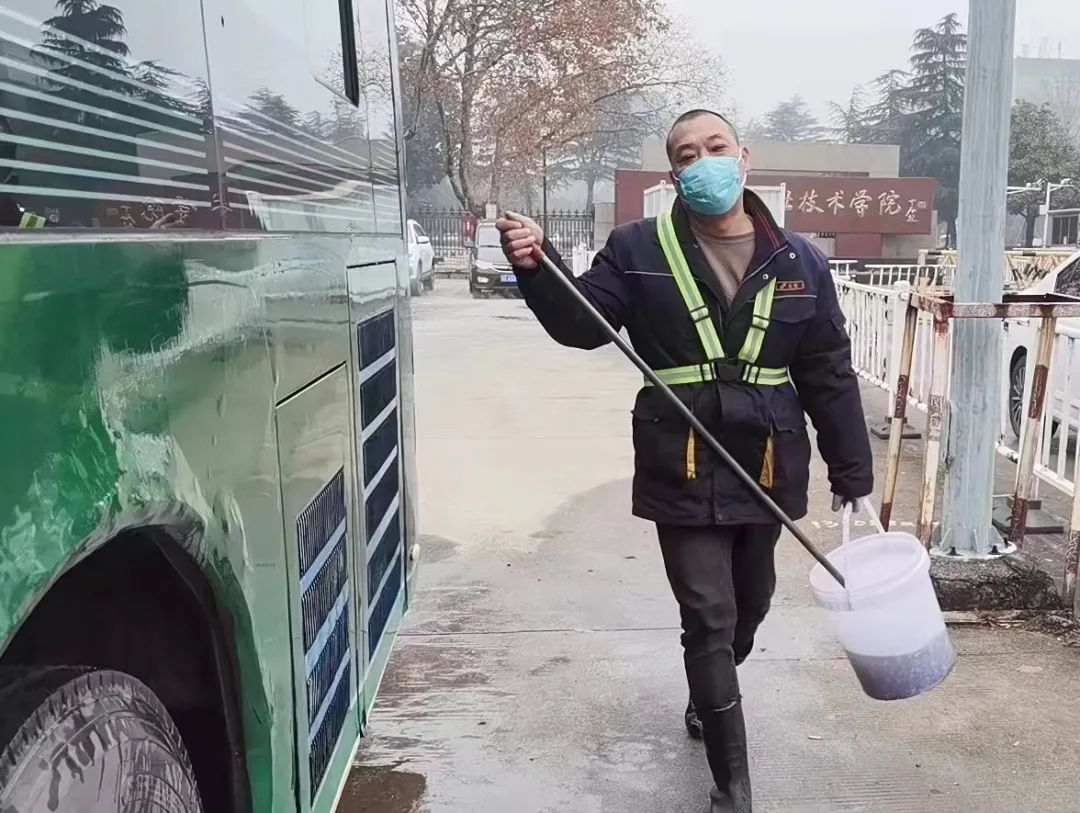 春運期間,為保障廣大市民乘客出行需求,部分公交線路縮短了發(fā)車時間,增加了運營車輛,再加上客流增多,路面擁堵等情況,公交車回到終點站停放的時間很短,又要投入到下一趟的運營當(dāng)中,這無疑給車輛保潔工作帶來了一定的困難。因此,為確保出場車輛干凈整潔,每天天沒亮,張璞已經(jīng)在建筑學(xué)院停車場里忙起來了。只見他一手拿毛刷,一手拎水桶,開始清潔車廂外部,張璞動作嫻熟地擦拭前擋風(fēng)玻璃、車廂外部兩側(cè),不一會,他的臉上就已掛滿了汗珠,平均一輛車10分鐘的清潔時間,是他十多年工作鍛煉出來的速度。近日氣溫驟降,持續(xù)有冰凍天氣,如果抹布太濕,早晨擦座椅時會粘在上面,為此張璞都會提前準備好潮濕的抹布,既能擦掉扶手、座椅、靠背上的浮塵,還不會留下水漬。像這樣日復(fù)一日的簡單工作,張璞堅持了十多年,他平均每天要打掃23臺車,平均一輛車10分鐘的清潔時間,張璞用自己的勞動,換來了車輛的干凈整潔。